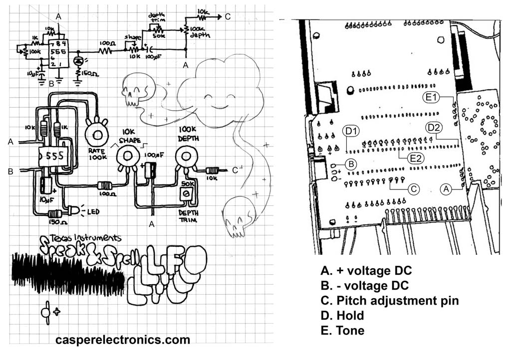 The “HOLD” feature in the schematic above takes some fine tuning to get right. There are parallel resistors and buffer resistors, a pot and a switch. The values of the potentiometer and resistors for this feature are meant for reference only. I’ve found that they often need to be tweaked from model to model. If you are new to bending, don’t bother with the adjustment and the trim resistors, just wire the switch to the two “hold” points on the main board. The same goes for the “LOOP” feature. The adjustment lets you fade between loop and glitch effects, but it takes some tweaking. It’s much easier to take out the pot and resistor and just wire in the switch.