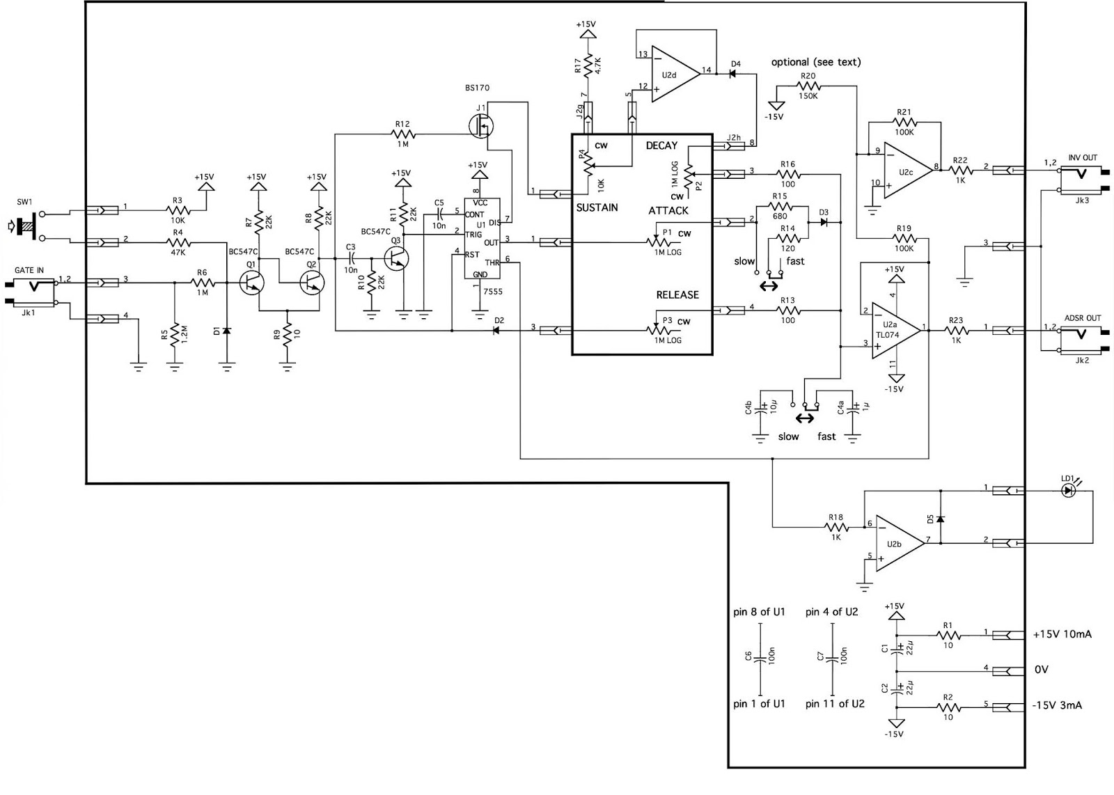Similarly for the ADSR, this is my schematic and this is the schematic I was trying to copy. The manual trigger switch generates an envelope, but I can’t get the Gate In jack to work with either the VCA (see previous question) or any “non-DIY” Eurorack modules borrowed from friends. As before, are there any errors that anyone with (fresher, more qualified) eyes can see that I’ve missed?