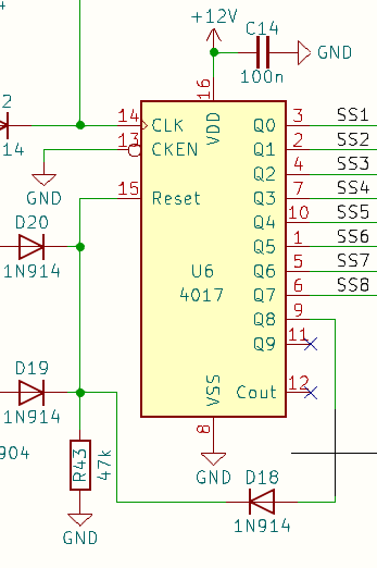 thanks for joining in, uhm, if I use only 8 steps, from a CD4017 chip, I normally connect pin 9 to the reset pinn15. in this case the Haraldswerk schematic, pin 9 isn’t connected to anything. Thats what’s throwing me off a little bit because in my baby8 sequencer, I connected pin9 to reset and everything works straight away. I also had no problems wiring the Rotary, so im not sure why this project feels more difficult? what im missing? anyways, when I get home I will try to swap out the chip. I hope its a faulty one, if another chip does the same, im thinking what to do with pin 9. or should I leave pin 9 out of the equation?