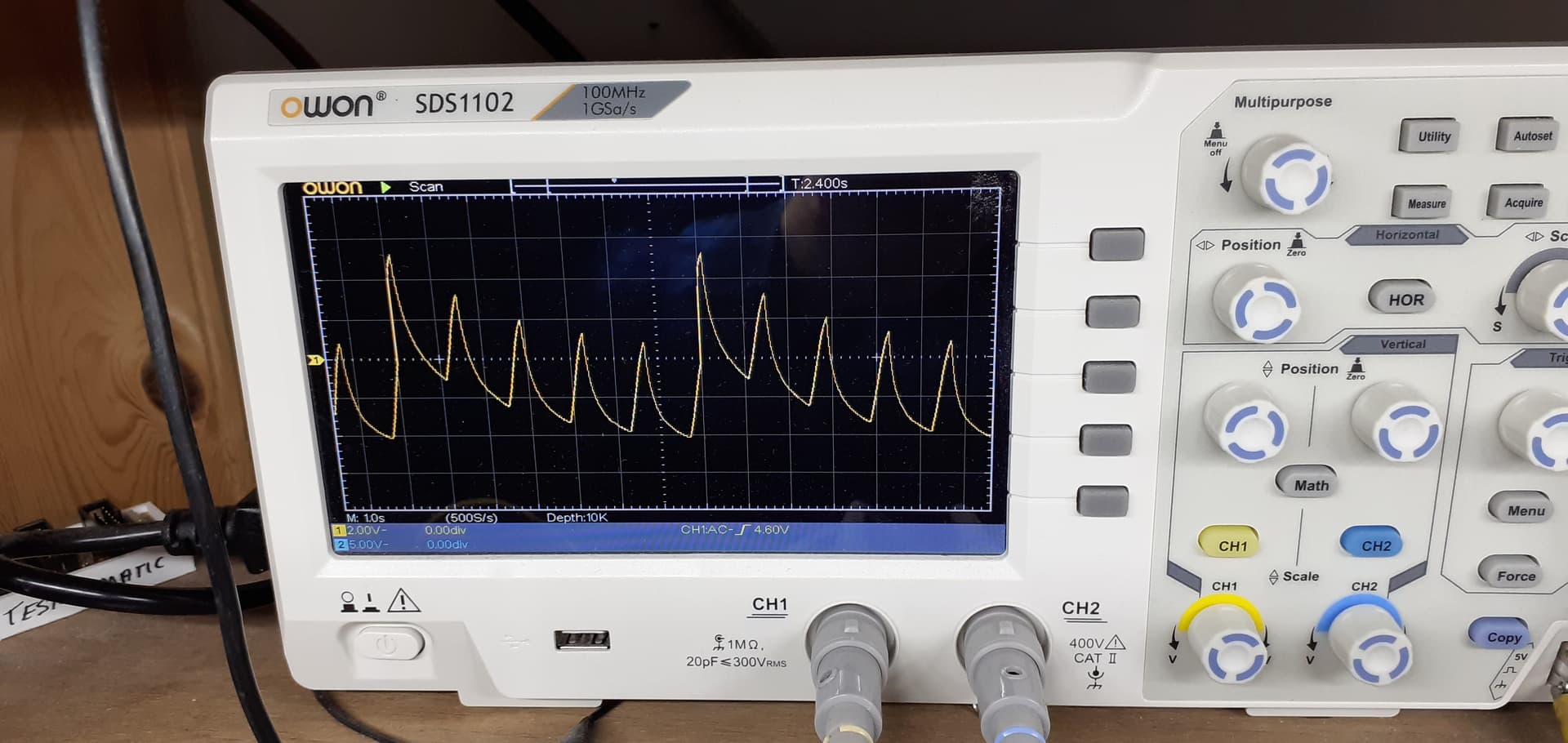 2 of the 4 PCBs under test. They are connected via a bus. Here the 1st gets a clock signal and starts an envelope and triggers the second generator (a bit later) as well.