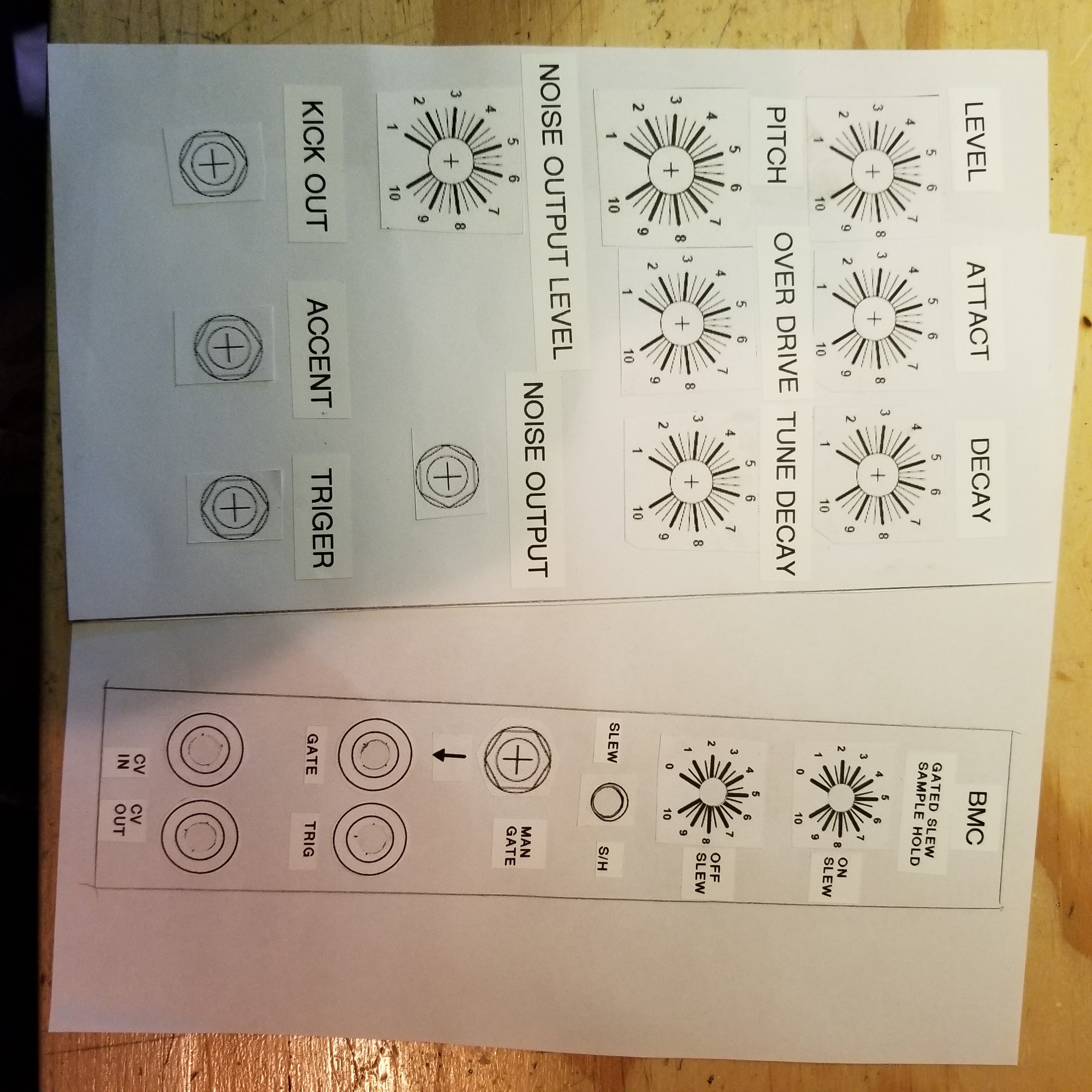 was frustrated with trying to use software layout programs so I just printed out the graphics and did the lettering with a label maker glued those to a sheet of paper in a 20cm x whatever grid . scanned that . sized the print out so it would be 20 cm tall then printed that on colored paper sealed it with a hot plastic sheet laminator spray glued that to the drilled alum. blank . the " art " work is just doodle scribbles on the original layup . don’t really have a file for it not sure it would scale right for euro rack as far as the spacing is concerned. should probably do a video on this one of these days .