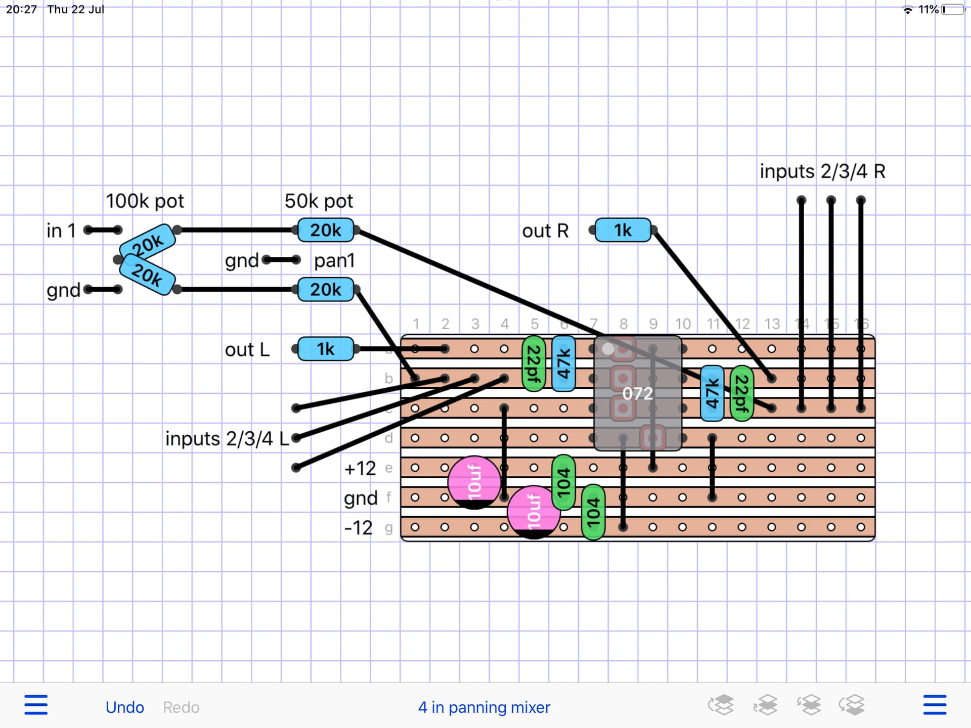 Slow build as usual but here’s another version panning mixer based on mfos super simple schematic . 4 inputs , repeat the layout for each input. Most resistors are panel mounted this time …don’t know if that saves time…check out the detail.