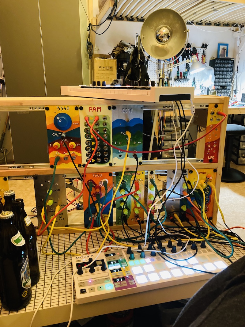 I have a house. My electronics bench is what used to be my mother’s sewing table, in an upstairs room. I had my synths there until recently, but the Kosmo was threatening to become too large for that, so it got moved into the basement. I’m pretty sure it’s still there, but it’s pretty cold down there in the winter so I haven’t spent much time there lately. I do have another (non DIY, non expanding) synth upstairs though.